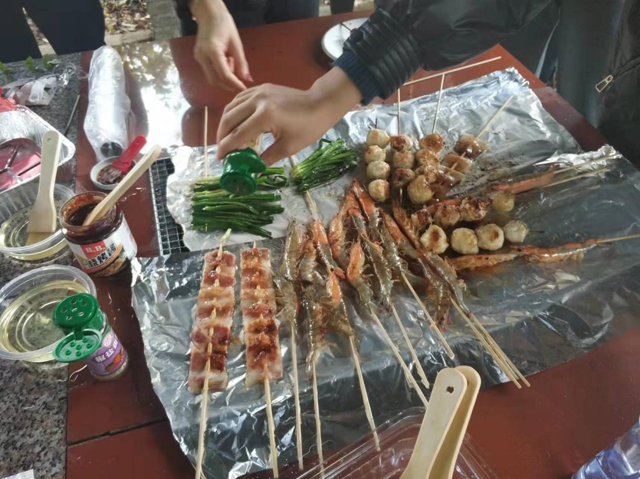 烧烤是集体出游必备的一项活动,在烧烤亭里自助烧烤更是别有一番风味。大家分工明确,刷油撒料,串制食物,轮流当烤串大厨。团队中有的是烧烤能手,有的是菜鸟小白,就在活动中相互交流烧烤经验,彼此学习。大家配合默契,没一会儿锡纸上的烤串就传来香味。